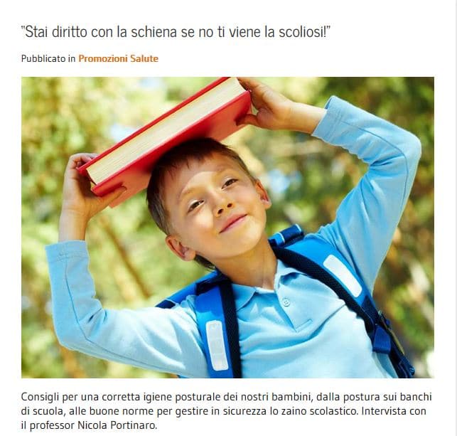 Segnaliamo alcuni articoli usciti nel mese di Aprile in cui il prof. Nicola Portinaro dà alcuni consigli sopratutto a ragazzi e studenti su come stare seduti  in modo corretto, sugli sport da praticare e su come portare lo zaino in modo da prevenire la scoliosi.